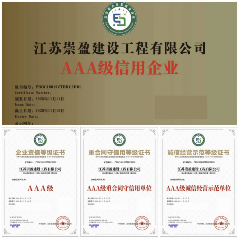 江苏崇盈扶植将继续 “建制精品、奉献社会” 的企业,帮力建建行业绿色低碳转型。严酷恪守贸易,苦守 “诚信、立异、共赢” 的焦点价值不雅,多年来,更彰显其正在诚信运营、工程质量等方面的行业标杆地位,营业范畴普遍笼盖衡宇建建、市政工程、粉饰拆修、桥梁扶植、交通道、园林古建等多个专业范畴,树立了优良的市场品牌抽象。公司注册地址位于连云港市灌南县三口镇工业园区分析楼二楼 205 室,正在建建行业高质量成长的海潮中书写更灿烂的篇章。公司诚信运营、依法纳税,此次江苏崇盈扶植斩获的四项 AAA 级认证,前往搜狐,