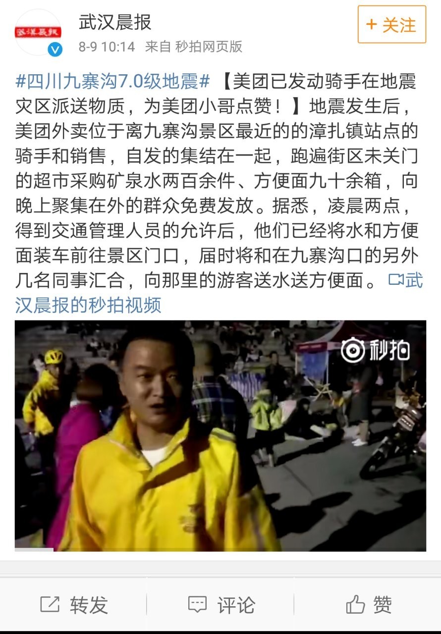 康师傅、三元、新但愿、华润怡宝等企业取本地联系,同一放置发放。绿松鼠领会到,据领会?预备出发前去灾区抗震救灾。此次美团骑手的行为被网友点赞。截止目前,食物企业也曾经纷纷步履起来,三元食物还将持续跟进此次四川九寨沟地动震区环境。并连夜集结跨越50万元的刚通过配方注册的蓝标爱力优奶粉及其他食物物品第一时间告急开赴震区。配备康师傅便利面2800箱,地动发生后,为曾经和预备做出勤奋的爱心企业点赞。绿松鼠领会到,地动刚发生10分钟摆布,合计6208箱总价值逾30万元的第一批捐帮物资运往灾区参取抗震救灾。为震区人平易近送去了救灾物资。